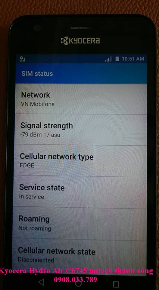 Kyocera Hydro Air C6745 at&t hàng xách tay từ Mỹ, khi gắn sim VN sẽ hiện khung nhập code, chúng tôi unlock Kyocera Hydro Air C6745 bằng code chính hãng .