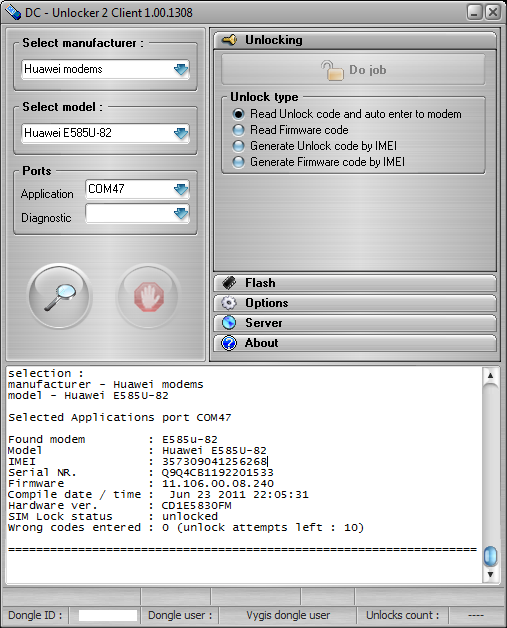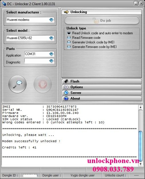 Chúng tôi unlock Huawei E585U-82 bằng thiết bị chuyên dụng của hãng.